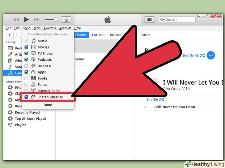 Виберіть іконку "домашній шарінг" зліва.під іконкою будуть вказані всі бібліотеки на першому комп'ютері. Виберіть те, що хочете скопіювати, або клікніть "редагувати" і виберіть "Вибрати все", щоб скопіювати все відразу.- Можна копіювати окремі файли, плейлисти або всю бібліотеку.