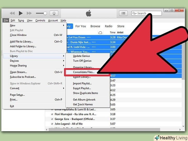 - Клацніть на файл і перетягніть курсор на бібліотеку. Виберіть "організувати бібліотеку", далі"консолідувати файли". З'явиться повідомлення про те, що всі файли будуть скопійовані в папку iTunes Media і це незворотно.