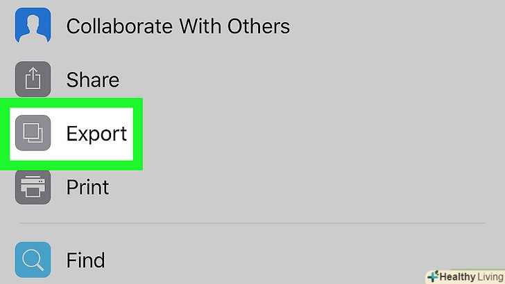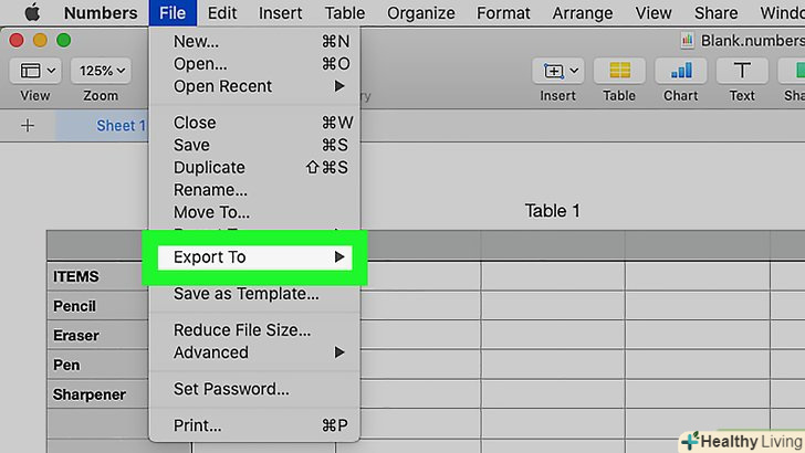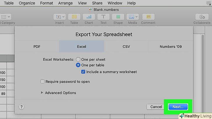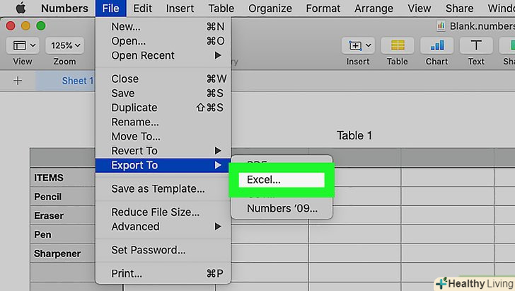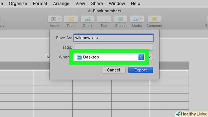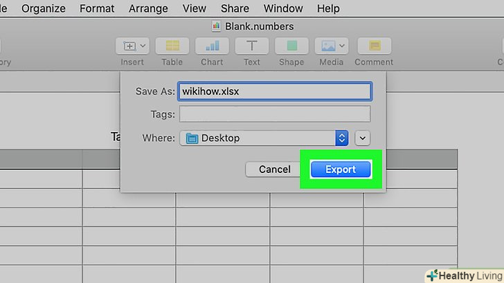 НатиснітьЕкспорт.ця опція знаходиться в нижньому правому куті вікна. Файл Numbers буде збережений у форматі XLS. Двічі клацніть по цьому XLS-файлу, щоб відкрити його на будь-якому комп'ютері, на якому встановлений Excel.