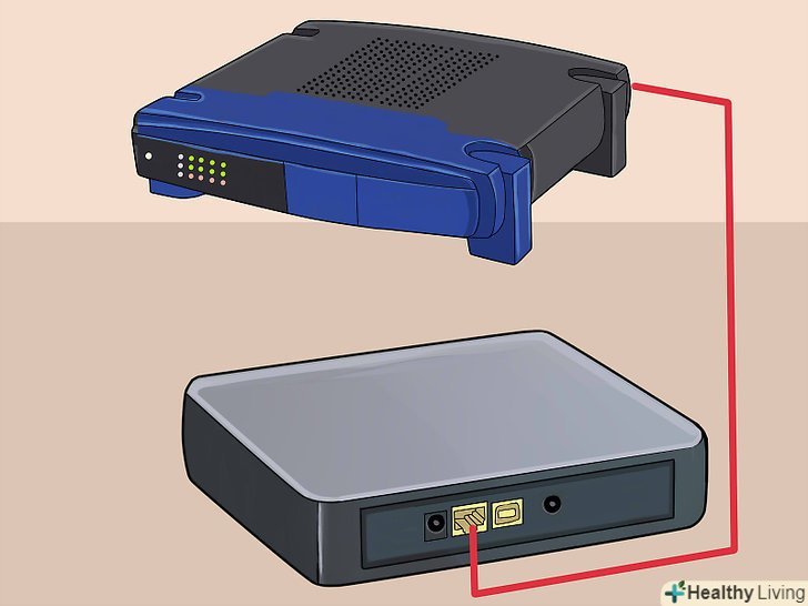 Підключіть маршрутизатор до модему.вимкніть модем і підключіть до нього маршрутизатор. Увімкніть модем.- Зараз модем повинен бути підключений до мережі (Інтернету) і до комп'ютера. Маршрутизатор повинен бути підключений до модему. Комп'ютер не повинен бути підключений до маршрутизатора.