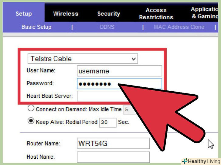 На сторінці налаштувань Linksys знайдіть рядки "User «(Ім'я користувача) і» Password" (Пароль). якщо ви не бачите їх, перейдіть на вкладку «Setup» (налаштування), а потім перейдіть на вкладку «Basic» (Основні). Введіть нове ім'я користувача та пароль.- Обов'язково запишіть введене ім'я користувача та пароль на випадок, якщо ви забудете їх.