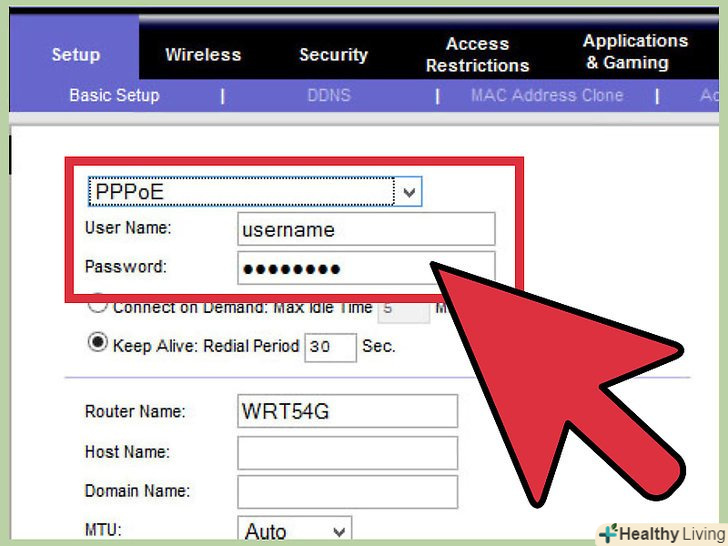 Введіть ім'я користувача та пароль, надані вам інтернет-провайдером.відкрийте меню " Internet Connection Type "(Тип підключення до Інтернету) і натисніть "PPPoE". Введіть ім'я користувача та пароль, надані провайдером. Натисніть " Save Settings "(зберегти налаштування).- Якщо у вас немає імені користувача та пароля, зверніться до вашого інтернет-провайдера.