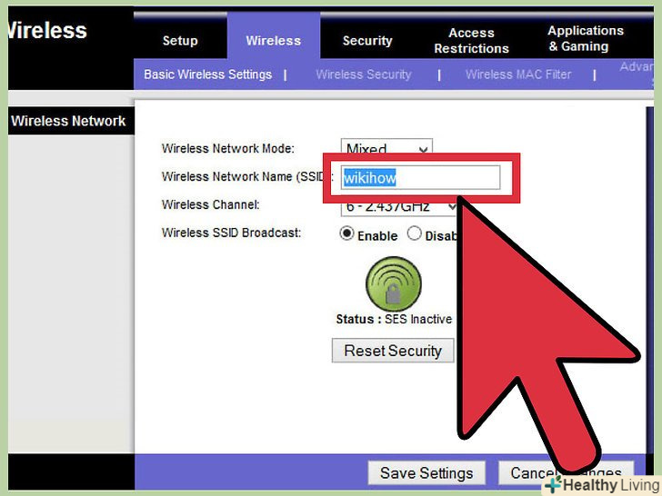 Змініть ім'я бездротової мережі.перейдіть на вкладку " Wireless "(Бездротова мережа), а потім натисніть «Basic Wireless Settings» (Основні налаштування бездротової мережі). У меню «Configuration View» (Кофігурація) виберіть «Manual» (вручну). В поле «Wireless Network Name (SSID)» (ім'я бездротової мережі) введіть ім'я для бездротової мережі. Натисніть " Save Settings "(зберегти налаштування).