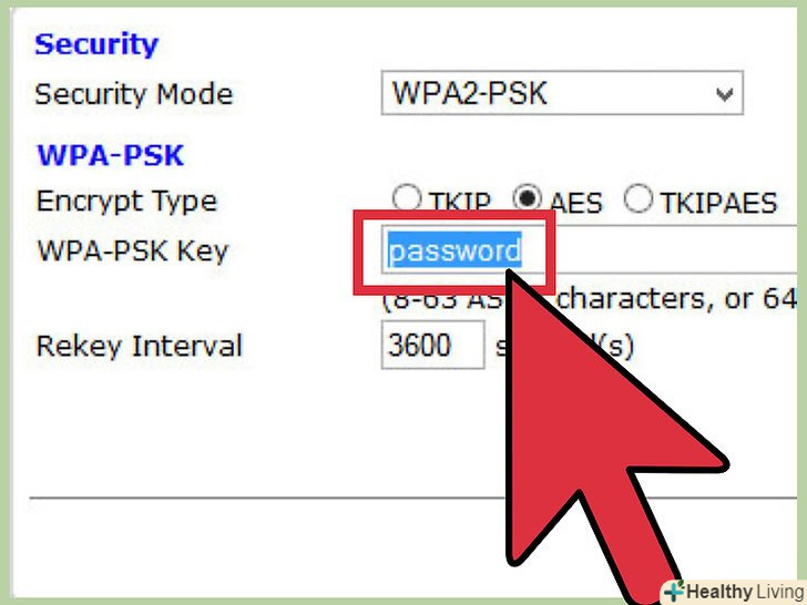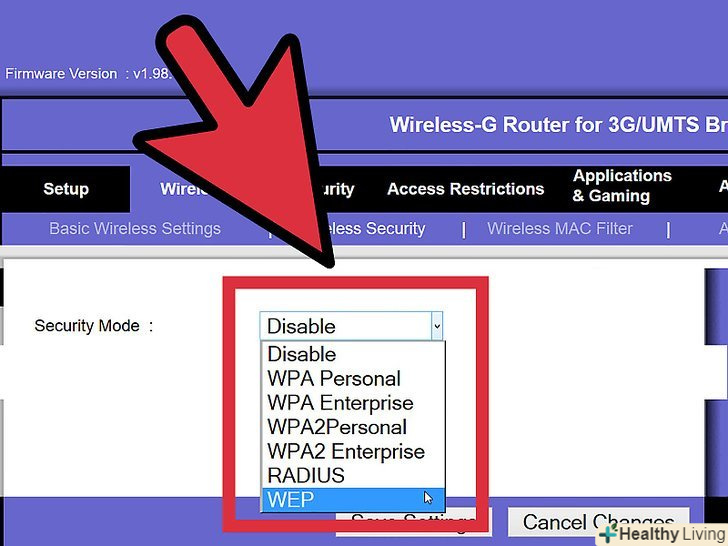 Встановіть рівень безпеки .відкрийте випадаюче меню «Security Mode» (Режим безпеки), а потім виберіть технологію захисту.- WPA2 є найбільш безпечною технологією, але технологія WEP сумісна зі старими пристроями. Рекомендується використовувати WPA2. Якщо це не спрацювало, використовуйте WEP.