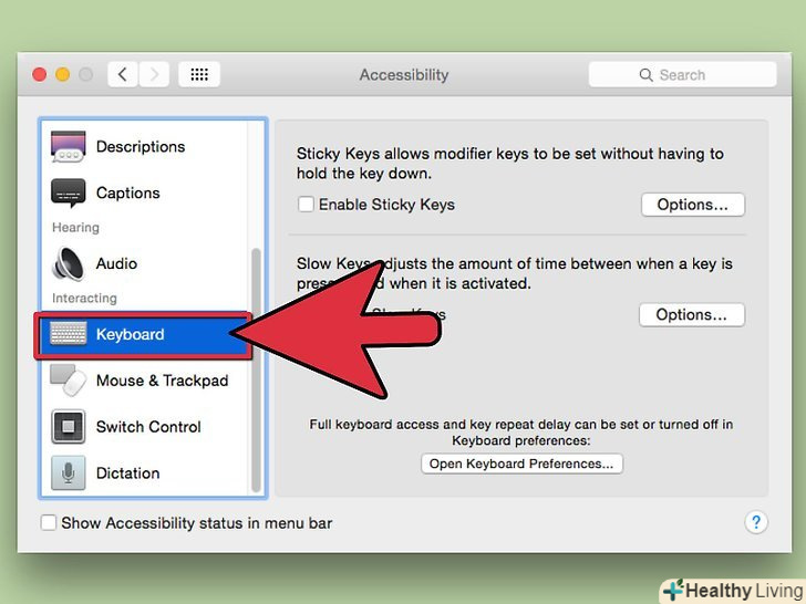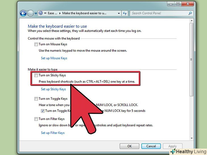 Виберіть вкладку "Клавіатура".зніміть прапорець поруч з полем "включити залипання клавіш".- Якщо ви залишите прапорець поруч з полем залипання клавіш, то ви можете вибрати включати і вимикати залипання клавіш за допомогою кнопки Shift. Перейдіть до наступного кроку, якщо ви вирішили зробити так.