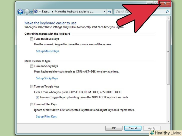 Закрийте вікно універсального доступу.якщо ви вибрали включення функції кнопки Shift, натисніть на кнопку Shift п'ять разів поспіль, щоб вимкнути її. Натисніть ще п'ять разів, щоб включити.[3]