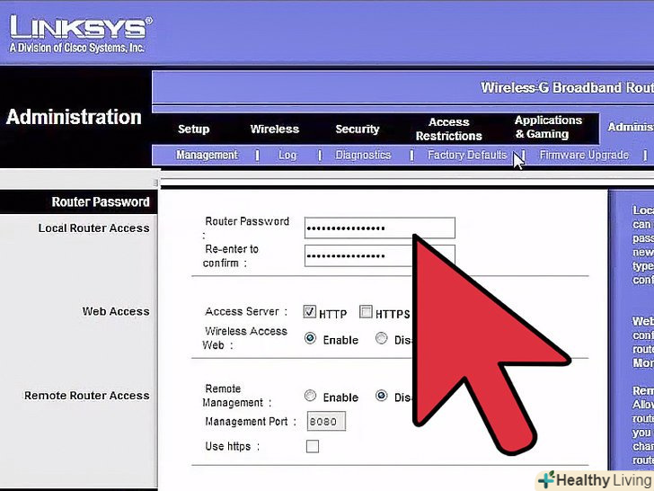 - Для Linksys -- це вкладка "Administration". Якщо у вас старіша модель роутера Linksys, тоді натисніть на вкладку"Password".[7]