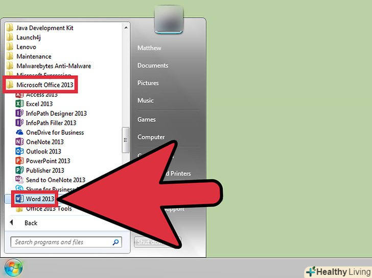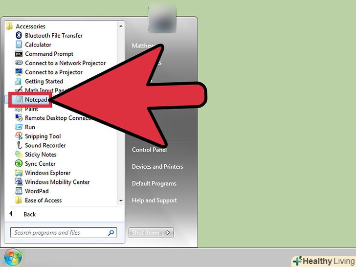 Відкрийте програму "Блокнот".Блокнот-це стандартний текстовий редактор, який знаходиться в папці «Офісні програми». Знайдіть цю програму, ввівши в пошукове поле на панелі завдань слово»блокнот".- Або відкрийте меню "Пуск«, натисніть на» всі програми «і знайдіть папку» Стандартні", в якій знаходиться Блокнот.