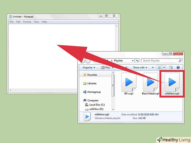 Натисніть і приберіть файл зі списком відтворення з його папки.файл необхідно перетягнути в інтерфейс блокнота.- Для цього помістіть Блокнот в одну сторону екрану, а папку зі списком ‒ в іншу.