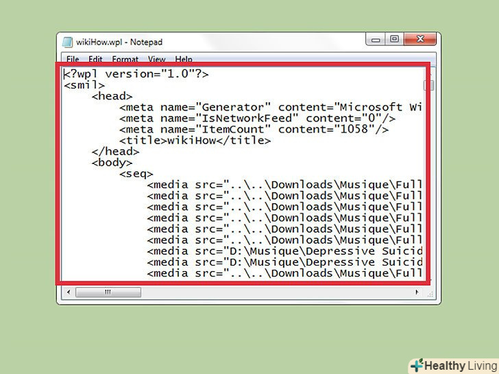 Перетягніть файл у Блокнот.ви побачите, як на екрані з'явиться довгий стовпець тексту. Блокнот зберігає пісні у форматі каталогу. Це означає, що мітки пісень будуть виглядати якось так: «\папка призначення\Music\[Ім'я виконавця]\[Альбом]\[назва пісні]».