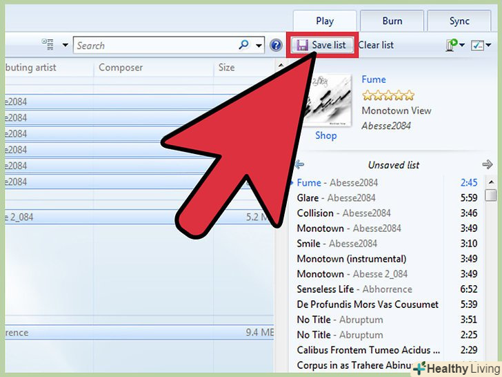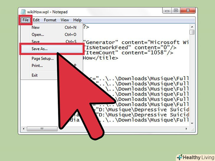 Збережіть файл.для цього необхідно натиснути на кнопку "Файл «в лівому кутку Блокнота, вибрати опцію» Зберегти як«, назвати файл і натиснути»ОК". Ви успішно зберегли список з піснями!