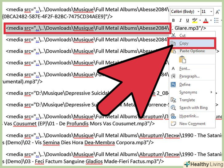 Скопіюйте мітки мультимедіа та папку призначення. для цього виділіть мітку «Lt;media src="..» на початку рядка, а потім скопіюйте її, натиснувши Ctrl+C. Текст необхідно виділити аж до імені виконавця, включаючи «\».
