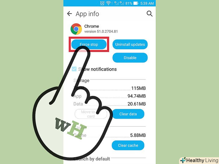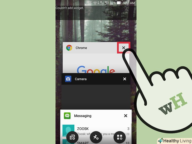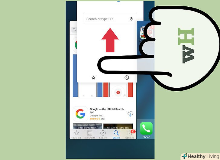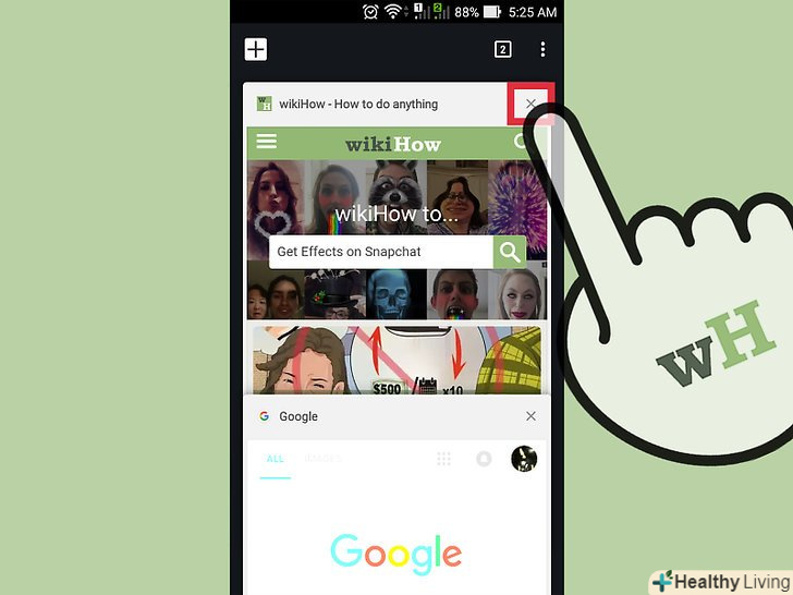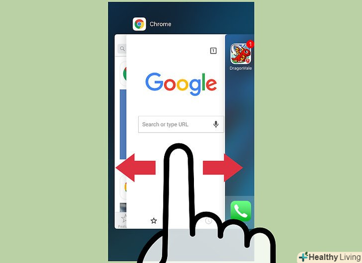 Проведіть пальцем по додатку Chrome зліва направо. Так ви закриєте це додаток, тобто воно не буде працювати у фоновому режимі.- Також можна натиснути на кнопку "x". Вона знаходиться в правому верхньому куті вікна Chrome в списку недавно відкривалися додатків (тільки якщо пристрій працює під управлінням Android 6 або пізнішої версії).