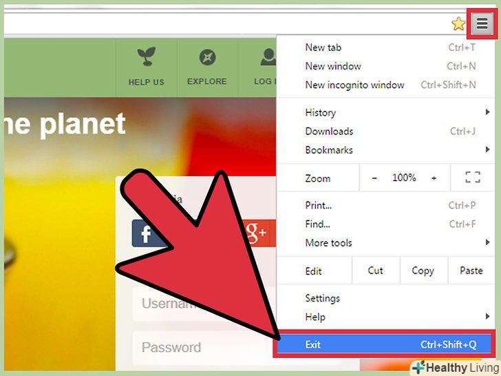 Клацніть по значку "≡ «і в меню виберіть»Вихід". цей значок розташований у верхньому правому куті вікна. Так ви закриєте всі вікна і вкладки і завершите процес.- В Windows можна скористатися комбінаціями клавішCtrl+⇧ Shift+Q або Alt+F4+Q.