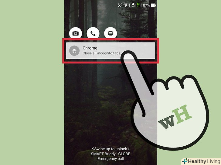 Закрийте вкладку "інкогніто" (тільки в Android).якщо вимкнути екран (кнопка живлення), коли відкрита вкладка «інкогніто», а потім включити його, відобразиться повідомлення «закрити вкладки інкогніто». Двічі клацніть по цьому повідомленню; всі вкладки "інкогніто" будуть закриті.- Майте на увазі, що вкладки "інкогніто" можна закрити так само, як звичайні вкладки.