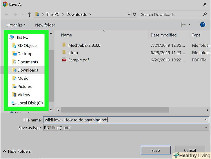 Виберіть папку для збереження PDF-файлу.клацніть по папці на лівій панелі, а потім по папці в центральному вікні, щоб вибрати потрібну папку.