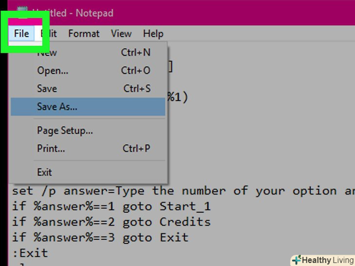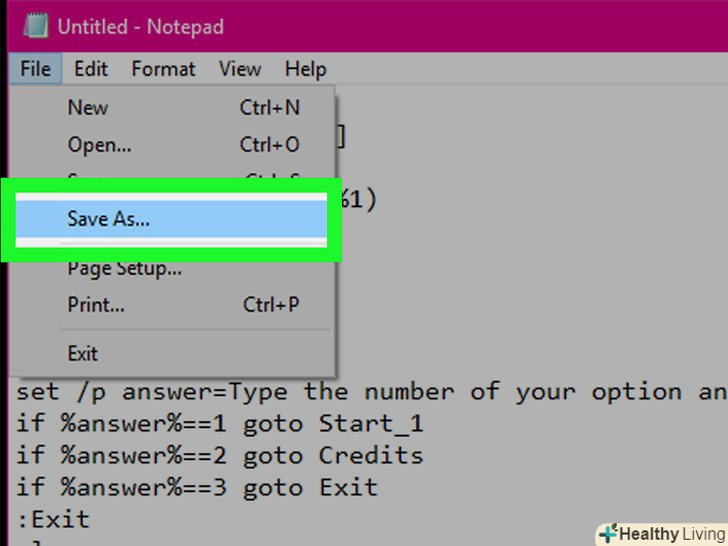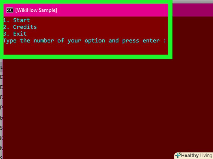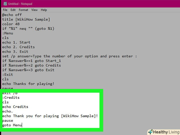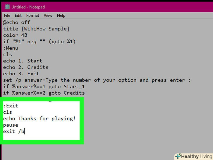 Задайте опцію "вихід".так гравці зможуть вийти з командного рядка. Скопіюйте наступний текст в Блокнот, а потім натисніть ↵ Enter::Exit Cls Echo спасибі за гру! Pause Exit /b