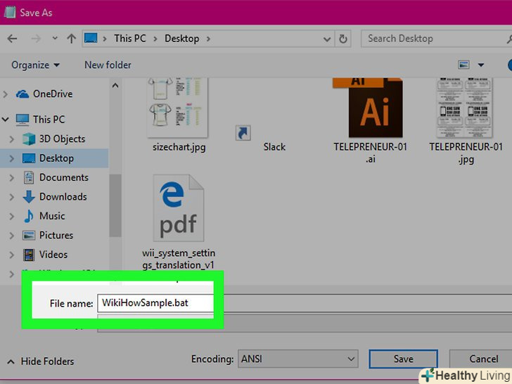 Введіть ім'я файлу, а потім введіть розширення".bat». у текстовому полі "Ім'я файлу" у нижній частині вікна введіть будь-яке ім'я файлу, а потім введіть розширення .bat, щоб гра збереглася у вигляді пакетного файлу.- Наприклад, щоб назвати гру «Dungeon Crawl», введітьDungeon Crawl.bat.
