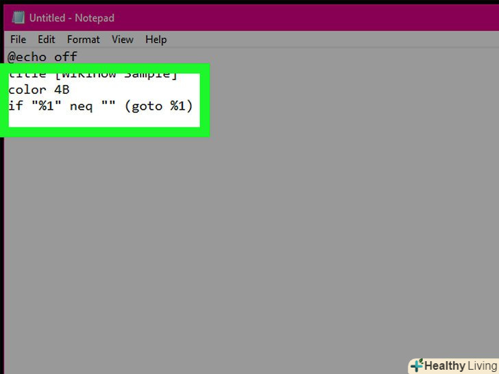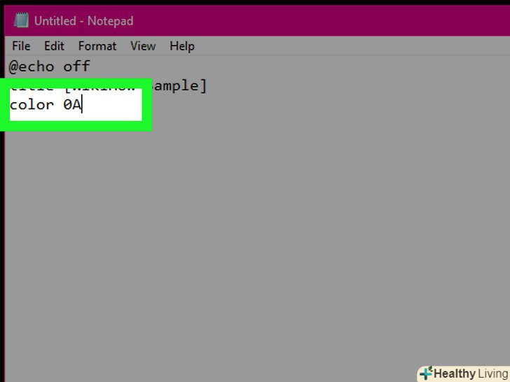 Визначитеся з кольором тексту і фону гри.щоб вказати колір, потрібно ввести код у форматі "0A«, де» 0 « — це колір фону, а» A" — це колір тексту. Коди поширених кольорів:[2]- колір тексту - використовуйте літери A, B, C, D, E або F для позначення світло-зеленого, світло-синього, світло-червоного, світло-фіолетового, світло-жовтого або білого кольору, відповідно.