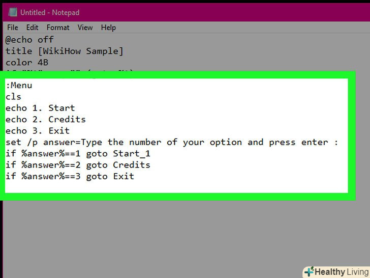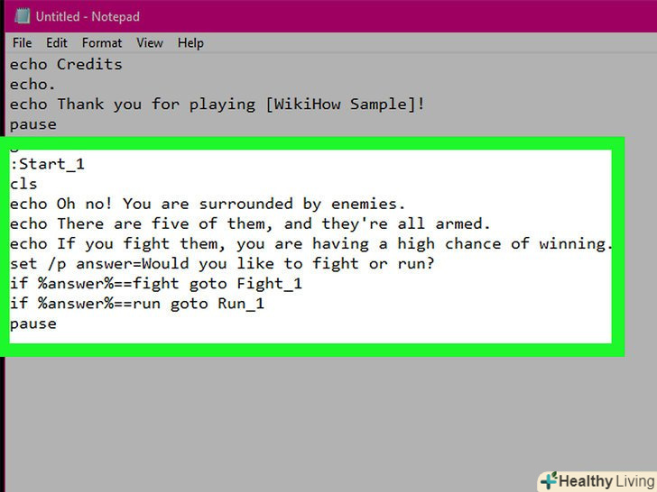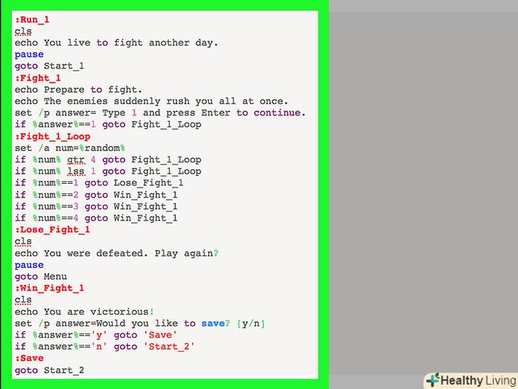 Введіть код дії. Введете наступний код, щоб задати дію гри::Run_1 Cls Echo ви вижили, щоб битися іншим разом. Pause Goto Start_1 :Fight_1 Echo приготуйтеся до сутички. Echo вороги раптово атакували вас. Set / pAnswer= натисніть 1, а потім натисніть Enter. If %answer%==1 Goto Fight_1_Loop :Fight_1_Loop Set /a Num=%Random% If %num% Gtr 4 Goto Fight_1_Loop If %num% Lss 1 Goto Fight_1_Loop If %num%==1 Goto Lose_Fight_1 If %num%==2 Goto Win_Fight_1 If %num%==3 Goto Win_Fight_1 If %num%==4 Goto Win_Fight_1 :Lose_Fight_1 Cls Echo ви програли. Зіграти ще раз? Pause Goto Menu :Win_Fight_1 Cls Echo ви перемогли! Set / p Answer=хочете зберегти гру? [д / н] If %answer%== ' д 'Goto 'Save' If %answer%== 'н' Goto 'Start_2' :Save Goto Start_2