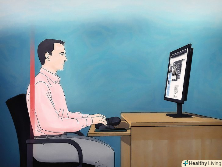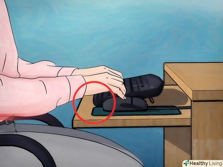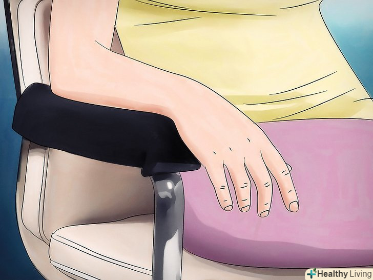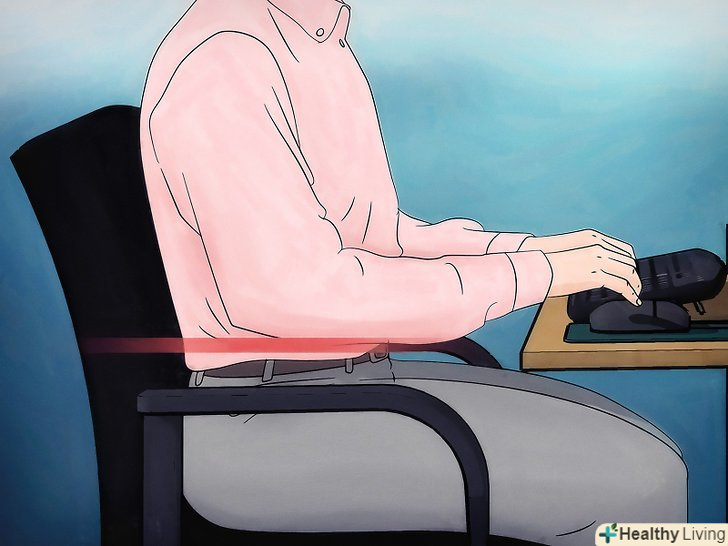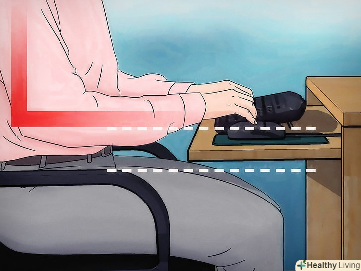 Лікті повинні знаходитися з боків тулуба.сідайте в зручне положення і переконайтеся, що лікті розташовані з боків тулуба. Використовуйте крісло з регульованими підлокітниками, щоб зручно розташувати лікті.[13]- Не обов'язково класти руки на підлокітники. Просто переконайтеся, що лікті знаходяться поруч з тулубом навіть без додаткової опори.