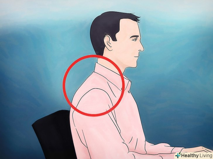 Розслабте шию і плечі.у процесі набору тексту плечі і шия повинні бути розслабленими. У більшості випадків для цього достатньо відкинутися на спинку крісла. Завдяки підтримці вони будуть залишатися прямими без зайвої напруги.[12]- Якщо ви не впевнені, що плечі розслаблені, зробіть повільний вдих і вихід. Положення, в якому плечі природним чином опиняться після видиху, зазвичай є розслабленим.