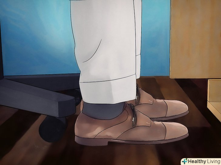 Ступні ніг повинні бути притиснуті до підлоги.коли розміститеся в кріслі, спробуйте сісти прямо і притиснути ступні до підлоги для підтримки нижньої частини тіла. Якщо схрестити або піджати ноги, вам буде складніше підтримувати правильну поставу. Відрегулюйте висоту крісла, щоб ваші ноги діставали до підлоги.[14]- Якщо крісло не регулюється по висоті, купіть ергономічну підставку для ніг, щоб ваші ступні розташовувалися в горизонтальному положенні.