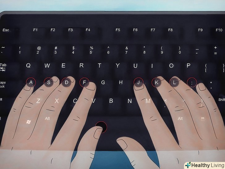 Правильно розташуйте пальці.найважливіший крок, який допоможе вам збільшити швидкість друку-правильна розстановка пальців. Вказівний палець лівої руки повинен знаходитися над клавішею "а", тоді як вказівний палець правої руки — над клавішею "О". Зазвичай на цих клавішах є невеликий виступ, який можна відчути без погляду на клавіатуру. Інші три пальці лівої руки розташовуються над клавішами "Ф", "И" і "В", а пальці правої руки — над клавішами "Л", "Д"і " Ж". Великі пальці знаходяться над пробілом.[4]- Ряд клавіш "Ф", "И", "В", "А", "О", "Л", "Д" І " Ж " вважається вихідним, оскільки пальці завжди виявляються над цими клавішами перед початком і після завершення набору тексту.