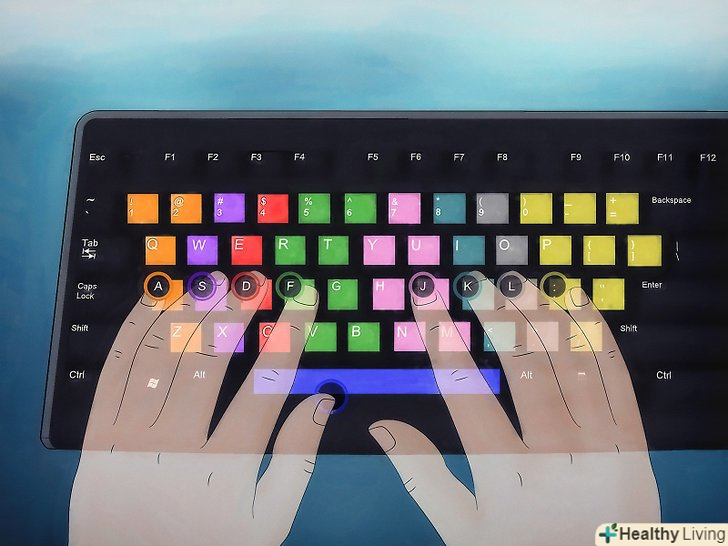 Ознайомтеся з клавіатурою.зазвичай використовується стандартна розкладка, але іноді можливі відмінності і додаткові функції. Прочитайте інструкцію або Керівництво по експлуатації клавіатури, щоб розібратися з функціями і дізнатися призначення гарячих клавіш. Після цього спробуйте візуалізувати розкладку клавіатури, щоб подумки звірятися з нею під час друку.[3]- Часто клавіатури оснащуються гарячими клавішами для швидкого виклику поширених команд або поєднань клавіш. Такі функції значно збільшують швидкість друку.