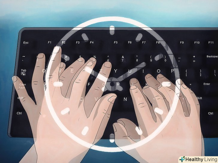 Регулярно відпочивайте.кількість практики впливає на швидкість друку, але також не забувайте про перерви. Якщо занадто захопитися, то існує ризик вимотатися або відчути біль (синдром зап'ястного каналу). Якщо з'явилося відчуття дискомфорту в кистях або зап'ястях, то пора трохи відпочити.[7]- Складіть графік практики друку з чіткою кількістю часу на кожен день, щоб не перевтомлюватися. Не забудьте вказати в графіку перерви. Наприклад, можна практикуватися 30 хвилин в день з перервами кожні 10 хвилин.