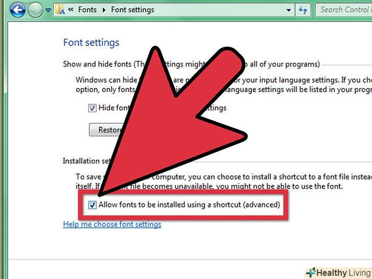 Використовуйте ярлик.ви так само можете вибирати шрифти, розташовані в іншій папці, або навіть на іншому диску. Використовуйте ярлик.ви так само можете вибирати шрифти, розташовані в іншій папці, або навіть на іншому диску.- У папці шрифтів Windows виберіть "параметри шрифтів". Цей пункт можна відкрити і через Панель управління.