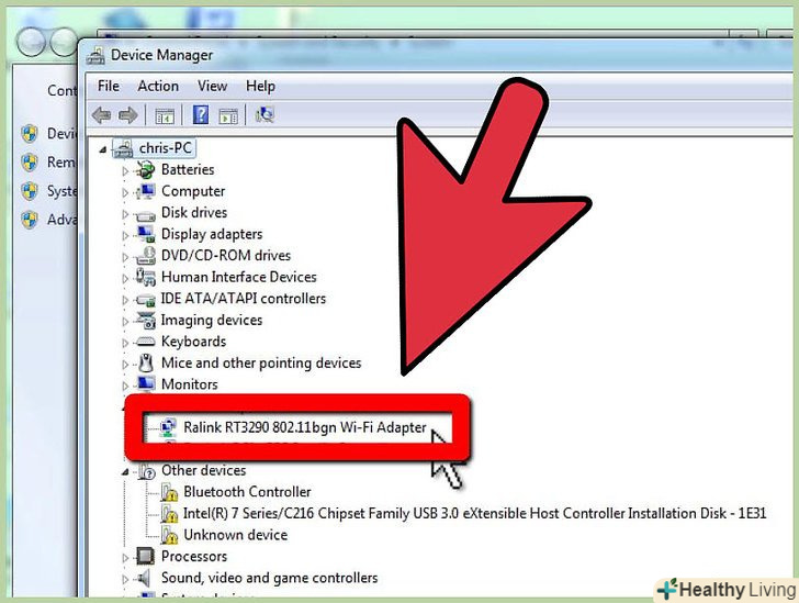 У лівій панелі вікна знайдіть рядок Диспетчер пристроїв.- Диспетчер пристроїв містить довгий перелік всіх пристроїв вашого комп'ютера. На малюнку виділено потрібний пристрій. Якщо ми збираємося перевстановити драйвера, спочатку нам потрібно щоб комп'ютер" забув", що у нього є такий пристрій (адаптер бездротової мережі) взагалі. Таким чином, комп'ютер "побачить" пристрій," прийде в себе " і перевстановить драйвера. Прийшла пора привести комп'ютер до тями. Натиснувши на трикутник біля рядка "мережеві адаптери", ви побачите кілька пристроїв у назві одного з яких (зазвичай) присутнє слово" Wireless "("Бездротовий").
