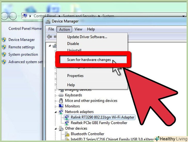 Натисніть меню " Дія "у верхній панелі Диспетчера пристроїв і виберіть"Оновити конфігурацію обладнання".- Ваш комп'ютер знайшов новий, хоч і трохи "поюзаний", Бездротовий адаптер! Windows повинна перевстановити драйвера, і, по ідеї, адаптер повинен заробити, як новий.