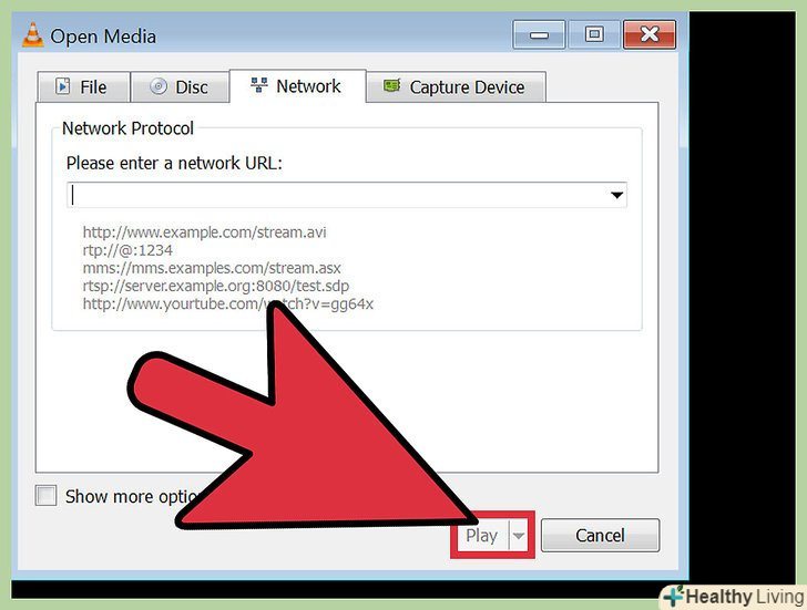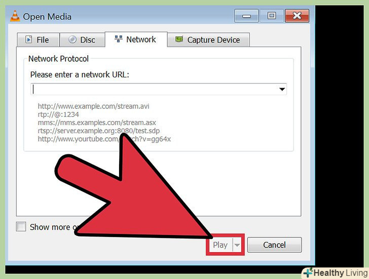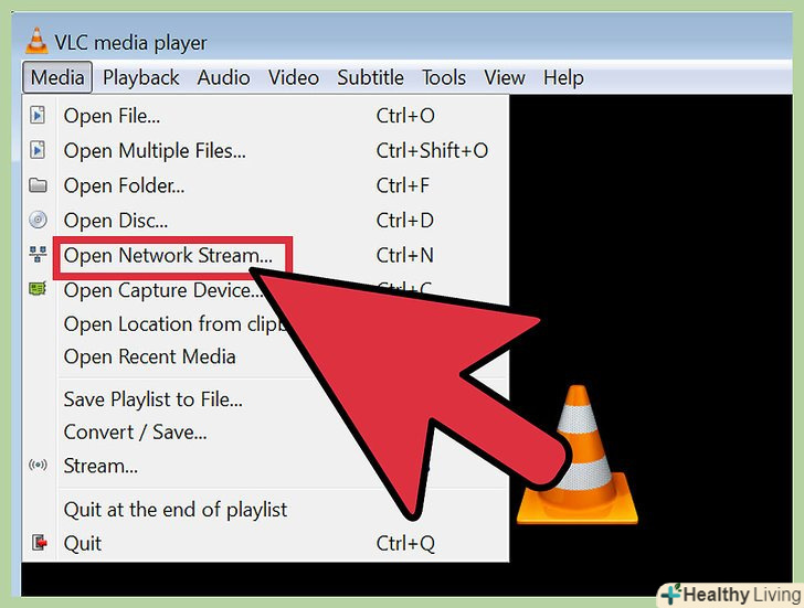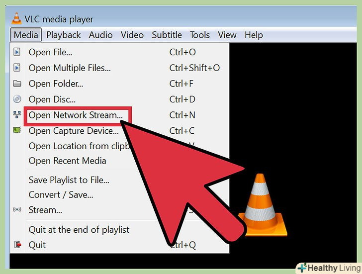 Налаштуйте медіаплеєр VLC.запустіть VLC, відкрийте меню "медіа «і натисніть»Відкрити URL". Вставте URL-адреса трансляції в рядок «Введіть мережевий адресу»; для цього натисніть Ctrl + V.