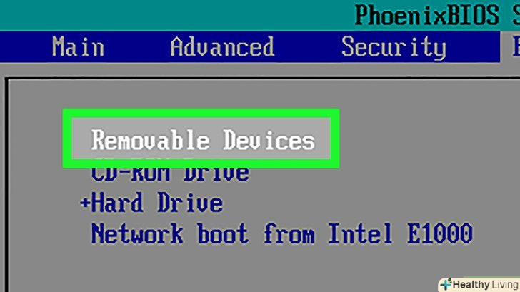 Виберіть зовнішній жорсткий диск. знайдіть ім'я або позначення зовнішнього жорсткого диска (наприклад, «External Hard Drive» — «зовнішній жорсткий диск») в меню «Boot order» (Порядок завантаження), а потім натисніть клавішу з спрямованою вниз стрілкою, щоб вибрати зовнішній жорсткий диск.- У деяких випадках в цьому меню потрібно вибрати опцію " USB devices "(USB-пристрої) або аналогічну. Якщо це так, переконайтеся, що зовнішній жорсткий диск є єдиним USB-пристроєм, який підключений до комп'ютера.
