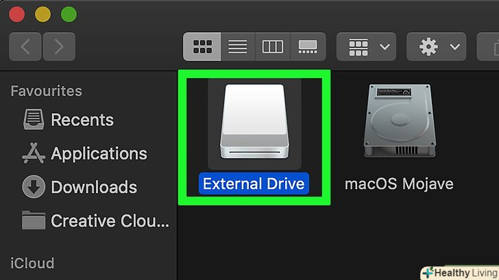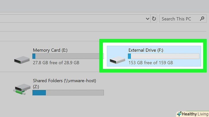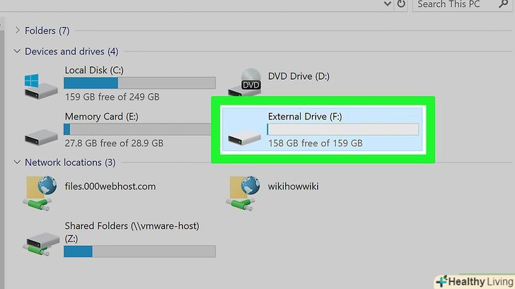 Підключіть зовнішній жорсткий диск до комп'ютера.Підключіть один кінець USB-кабелю до USB-порту на комп'ютері, а інший кінець — до зовнішнього жорсткого диска.- На зовнішньому жорсткому диску є світлодіод, який блимає або горить, коли диск підключений до комп'ютера.