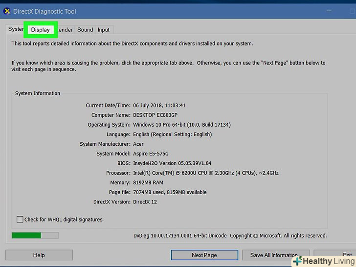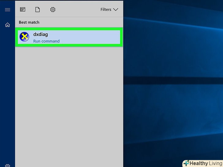 Запустіть засіб діагностики DirectX. введітьdxdiag , а потім клацніть по пурпурно-жовтому значку «dxdiag» вгорі меню «Пуск».