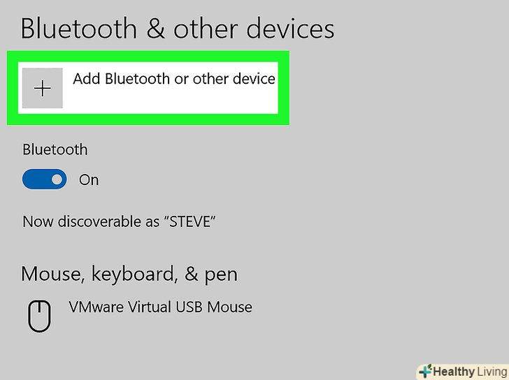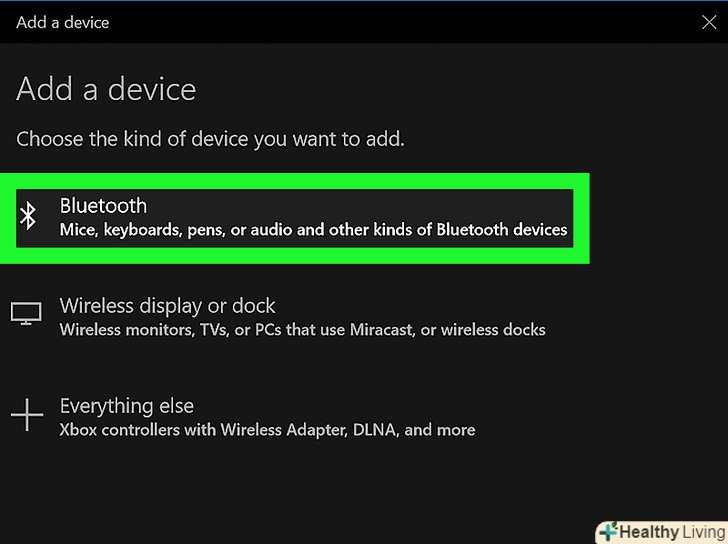 НатиснітьBluetooth.це перша опція у спливаючому вікні "Додати пристрій". Система приступить до пошуку доступних Bluetooth-пристроїв.- Переключіть бездротові навушники в режим сполучення.для цього натисніть і утримуйте певну кнопку (або кнопки) на корпусі навушників. Якщо ви не знаєте, яку кнопку натиснути, почитайте інструкцію до навушників. Коли комп'ютер виявить бездротові навушники, вони з'являться у спливаючому вікні "Додати пристрій".