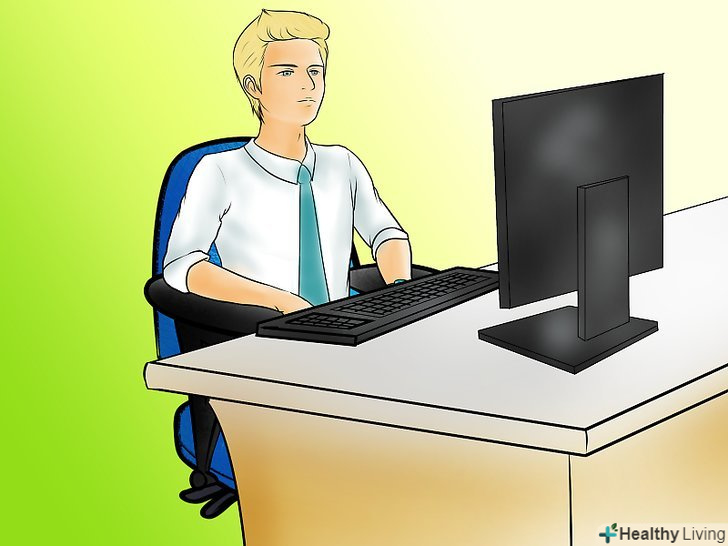 Прийміть природну позу.влаштуйтеся в природному розслабленому положенні. На жаль, такою позою вважається положення зародка, тобто вам доведеться внести в неї деякі зміни, щоб бути здатним щось робити. Сядьте так, щоб ваші руки залишалися вільними для роботи. Оскільки це перекладе вагу на вашу спину, випряміть її так, щоб вага, не Підтримуваний спинкою стільця, розподілився акуратно по низу хребта без навантаження на м'язи і сполучні тканини спини. Збалансуйте положення рук і ніг так, щоб не напружувати спину або інші більш тонкі кінцівки. Це повністю звільнить вашу увагу для роботи.- Використовуйте те, що у вас є. У вас може не бути певного обладнання, або ваше обладнання не буде певним чином відрегульованим, або відрегульоване обладнання буде несумісним з вашою роботою (можливо, ви – працівник стійки реєстрації, який весь час повинен сидіти прямо). Пройдіться по всіх перерахованих нижче кроків і спробуйте максимально наблизитися до рекомендацій, тут сказаним. Коригування однієї частини вашої установки часто може полегшити коригування інших частин. Потім обміркуйте, на що саме слід витратити гроші для покупки додаткового обладнання, щоб вирішити залишилися проблеми.