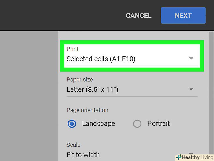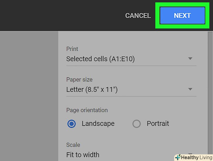 НатиснітьВибрані комірки В меню «друк».ви знайдете його у верхньому правому куті сторінки «Налаштування друку».