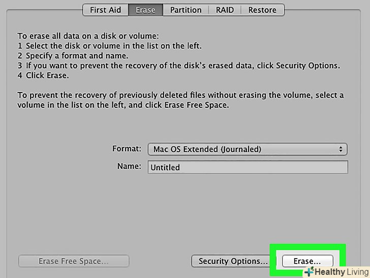 Клацніть по вкладціСтерти.вона знаходиться у верхній частині вікна "Дискова утиліта". Відкриється нове вікно.