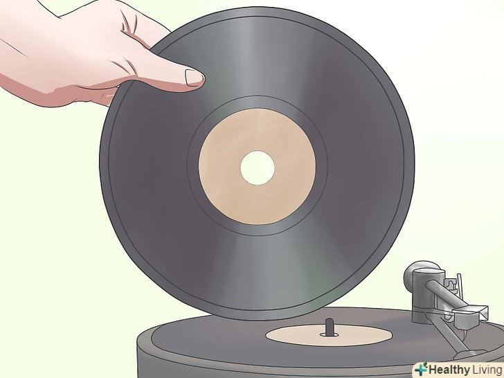 Поставте пластинку на поворотний диск.на цьому круглому диску платівка буде надійно фіксуватися під час програвання. Тримаючи пластинку за торець, покладіть її на диск, так щоб штир на диску потрапив в отвір на платівці. Трохи натисніть на пластинку, щоб вона щільно лежала на диску, якщо вона занадто щільно йде по штирю.- Поворотний диск часто зроблений з металу, але зверху повинен бути покритий гумою або іншим м'яким матеріалом. Цей мат захищає і фіксує платівку, ніколи не вмикайте програвач без нього.