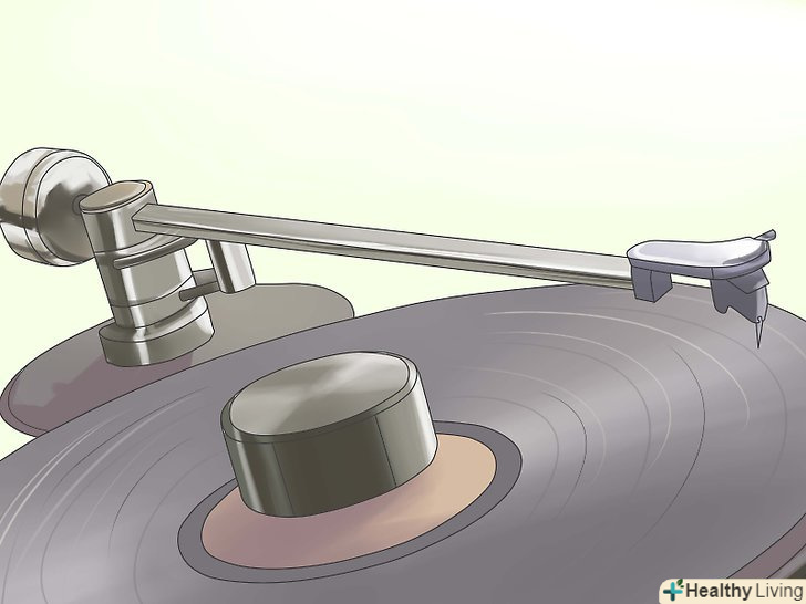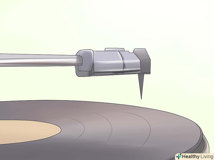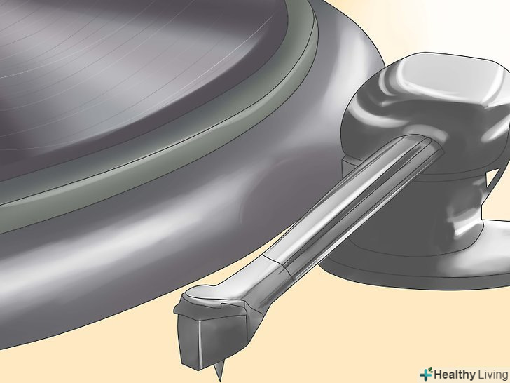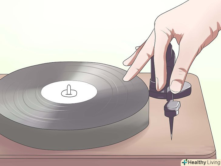 Підніміть тонарм.багато програвачів оснащені автоматичним ліфтом, який сам підніме тонарм, як тільки ви задієте перемикач. Якщо на вашому програвачі немає ліфта, акуратно підніміть тонарм, притримуючи його одним пальцем за ручку, яка знаходиться біля голови тонарма.