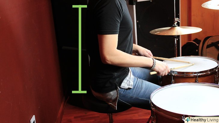 Відразу звикайте до правильної посадки за барабанами.правильна посадка забезпечить вам доступ до всіх барабанів і меншу стомлюваність. З правильною посадкою у вас буде краще звучання, та й вам самим буде комфортніше.- Спина повинна бути рівною і вертикальною, лікті опущені вниз, паралельно тулубу. Максимально присуньтеся до установки, дотримуючись комфортну дистанцію для ніг на педалях.