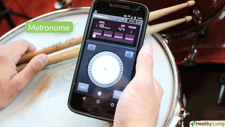 Обзаведіться метрономом.гра під метроном може бути дуже складним завданням спочатку, вам доведеться грати рівно, не плаваючи в темпі, але це найкращий спосіб розвинути надійне почуття ритму. Замість окремого пристрою ви можете встановити додаток на свій смартфон або використовувати клік-трек з музичної програми на вашому ноутбуці.[6]- Перенесіть малюнок, який ви грали на колінах, на барабанну установку.грайте 8-ті ноти по хай-хету, лівою рукою бийте на рахунок 2 і 4, і грайте по бас-барабану на рахунок 1 і 3.
