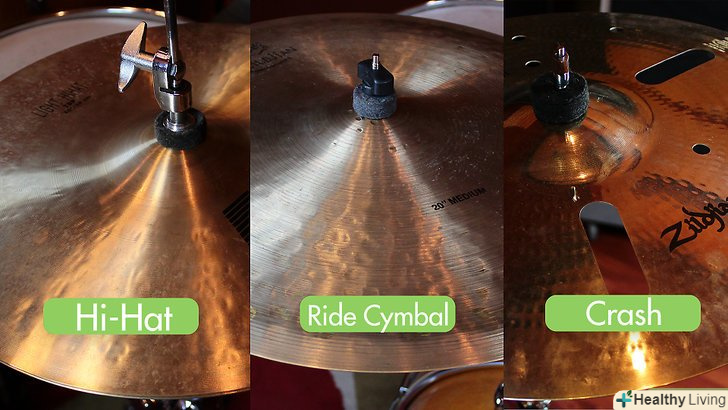 Тарілки. тарілки також можуть бути різних форм і розмірів. Тарілкою називається круглий музичний інструмент, що видає резонанс, коли по ньому граєш. Чотири найпоширеніші тарілки: хай-хет, райд, Креш і сплеш.[2]- Хай-хет-це набір з двох тарілок, які встановлюються на стійці з педаллю. По педалі найчастіше грають лівою ногою. Вона притискає тарілки один до одного, коли натиснута, і розводить, коли вільна. Ви можете вдарити по тарілках з відпущеною педаллю і, натискаючи на педаль, контролювати швидкість заглушення.