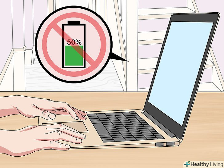 Переконайтеся, що комп'ютер не перегрівся.висока температура знижує ефективність роботи акумулятора і може пошкодити його. Якщо ви використовуєте ноутбук в умовах високих температур, переконайтеся, що вентиляційні отвори ноутбука вільні.[4]- Покладіть ноутбук на рівну прохолодну поверхню, таку як письмовий стіл. Не варто тримати ноутбук на колінах-це ускладнює циркуляцію повітря, а температура вашого тіла призводить до додаткового нагрівання пристрою.