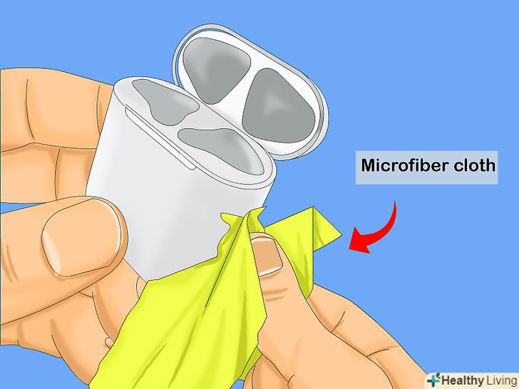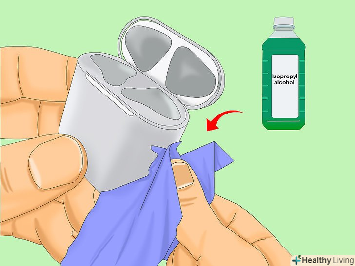 Зволожите серветку, якщо це необхідно.можна змочити серветку дистильованою водою, а якщо на футлярі є стійкі забруднення, то невеликою кількістю ізопропілового спирту. Рідини має бути мінімальна кількість, а краще і зовсім обійтися сухим очищенням.- Як самі навушники AirPods, так і зарядний футляр для них не є водонепроникними. Намагайтеся не допустити потрапляння рідини в Зарядні порти або на самі навушники.[1]