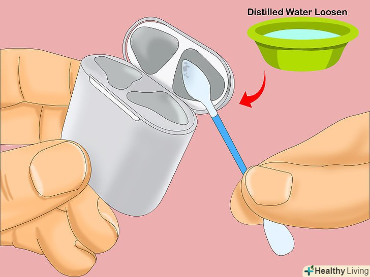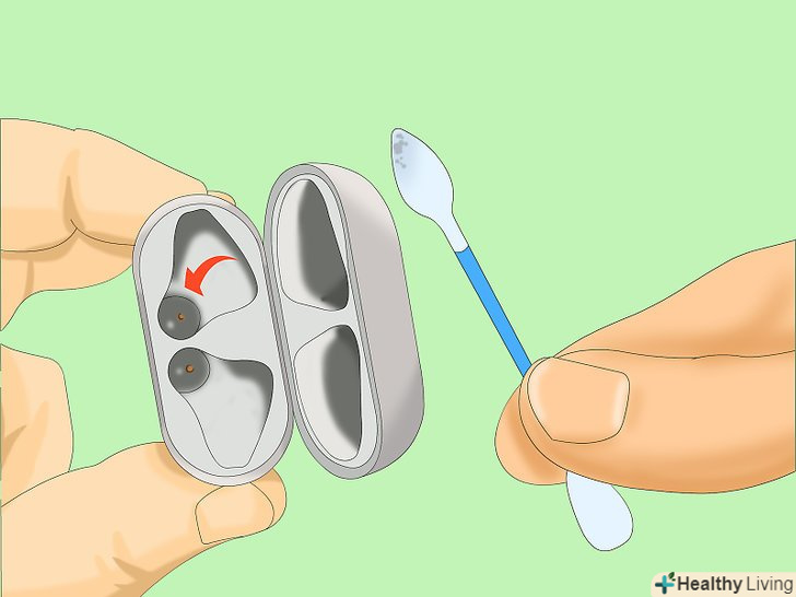 Протріть поглиблення на внутрішній поверхні кришки футляра.коли кришка чиста, футляр виглядає як новий. Якщо необхідно, злегка змочіть паличку водою або спиртом. Слідкуйте, щоб рідина не капала з ватної палички, інакше краплі потраплять на контакти всередині футляра. Злегка зволоженою ватною паличкою можна без праці видалити пил і вушну сірку.