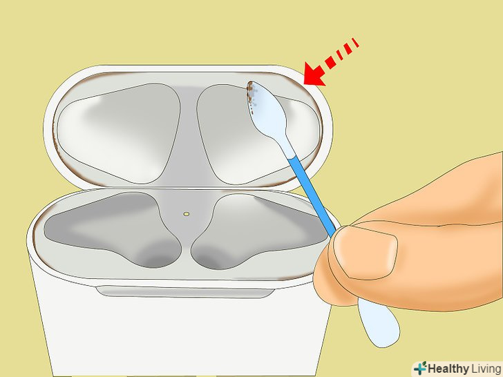 Ретельно протріть Зарядні порти.за допомогою ватної палички або шматочка вати протріть Зарядні порти (отвори всередині футляра, куди вставляються навушники AirPods для зберігання і підзарядки), а також всі поглиблення і виїмки. Необхідно максимально видалити пил і ворсинки з контактів, щоб навушники заряджалися швидше, а також щоб запобігти замикання.